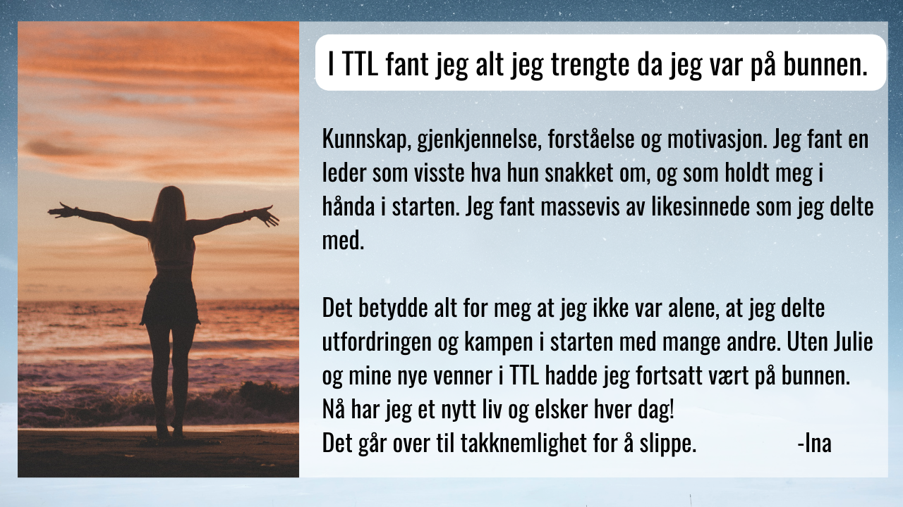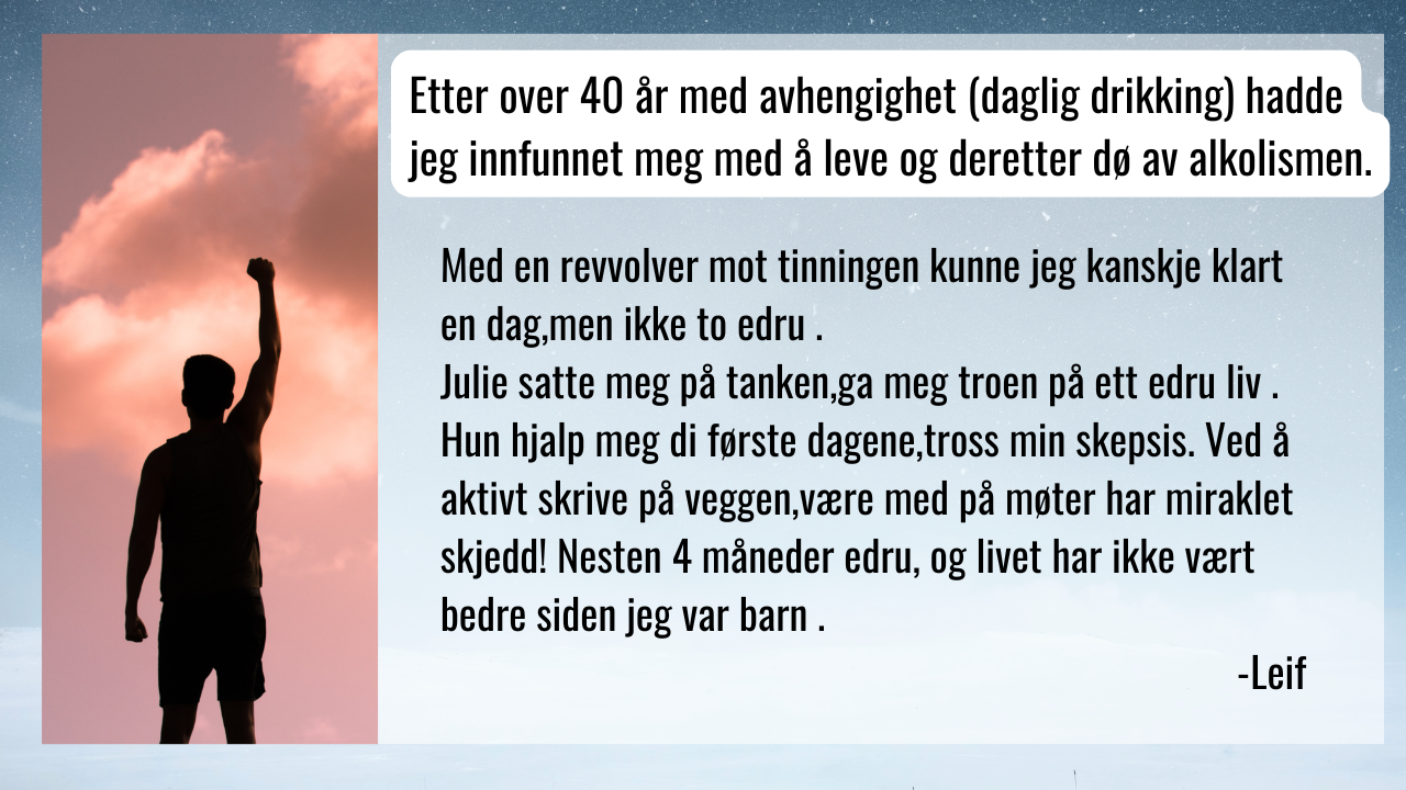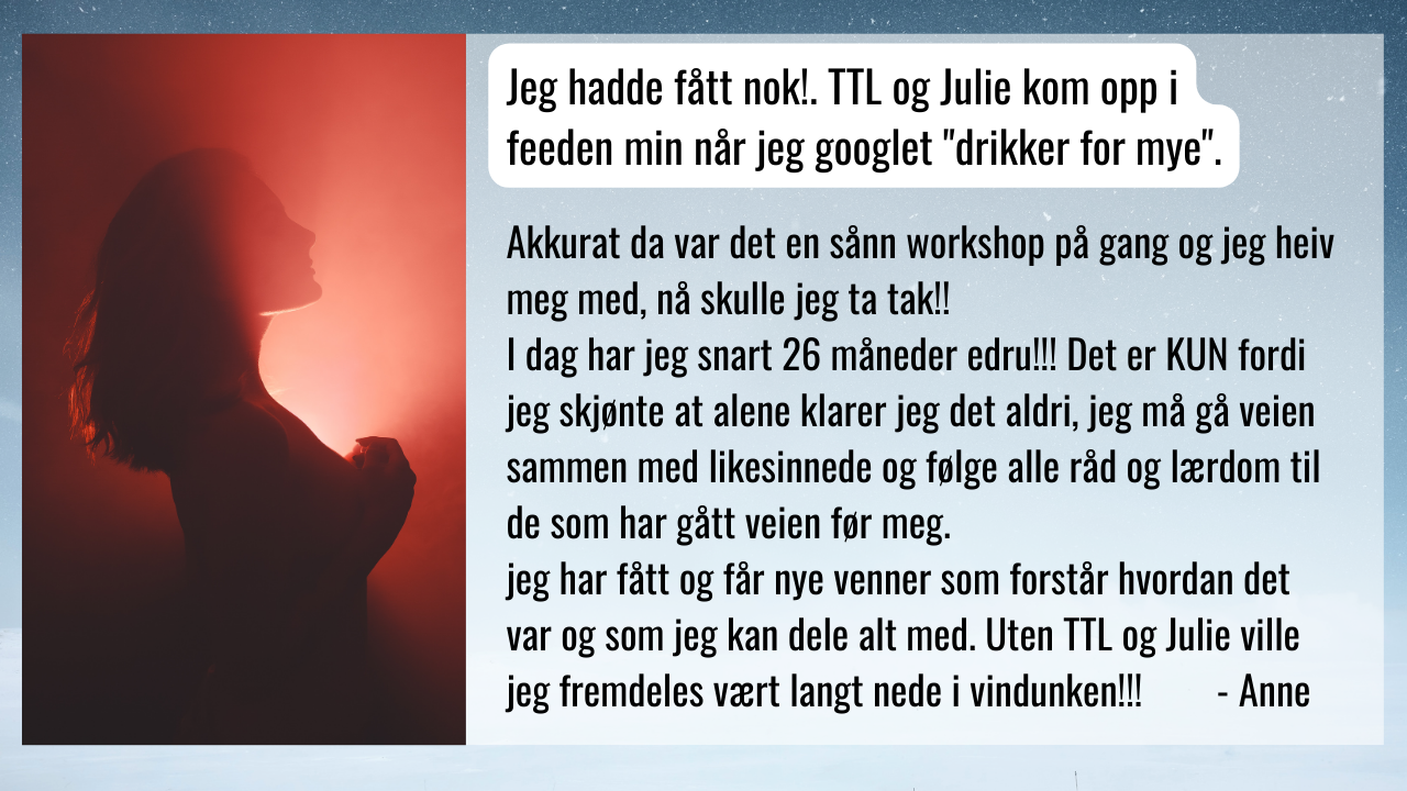 Dette skjer UTEN krav til edru/nykterskap. Det er den eneste mÄten vi fÄr til det vi selv vil pÄ, uten moralske krav med ubrukelige fortegn og setninger. Her i Tilbake Til Livet er det ingen Mà , BURDE eller SKAL. Her blir du med pÄ en solid vei over 2000 mennesker har gÄtt fÞr deg siden vi startet i 2017.