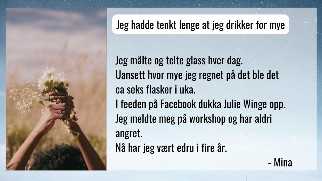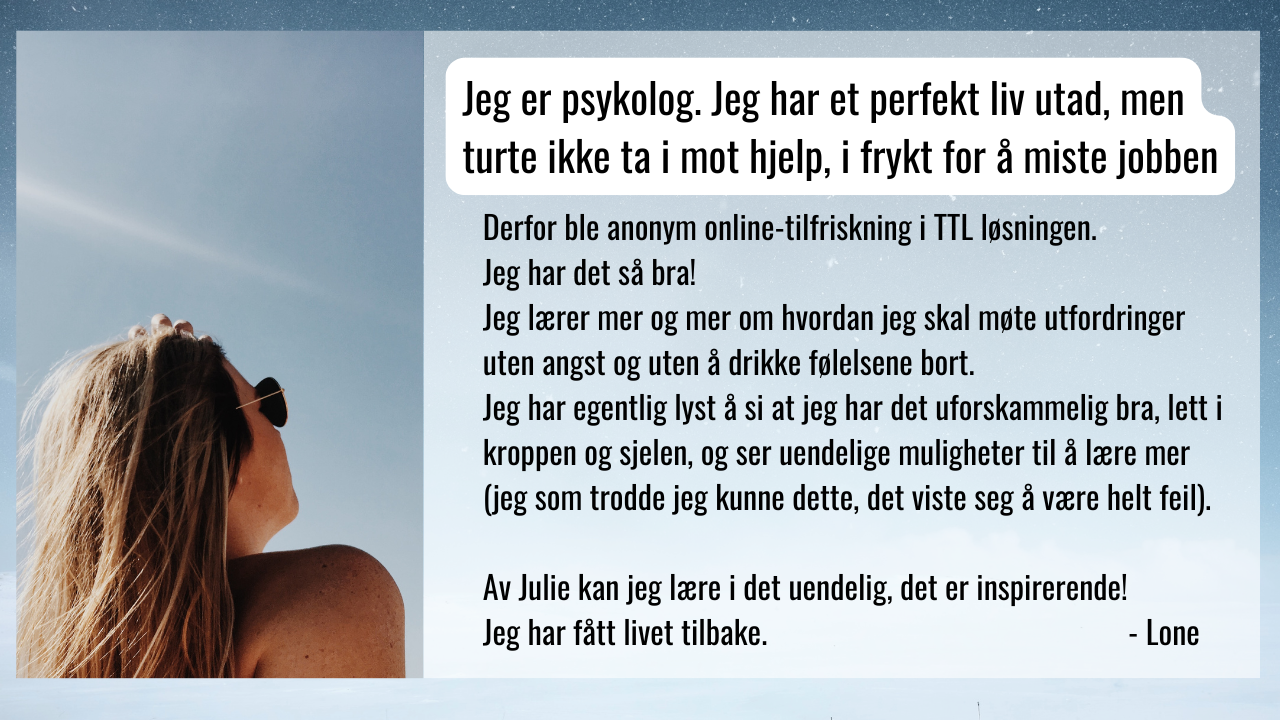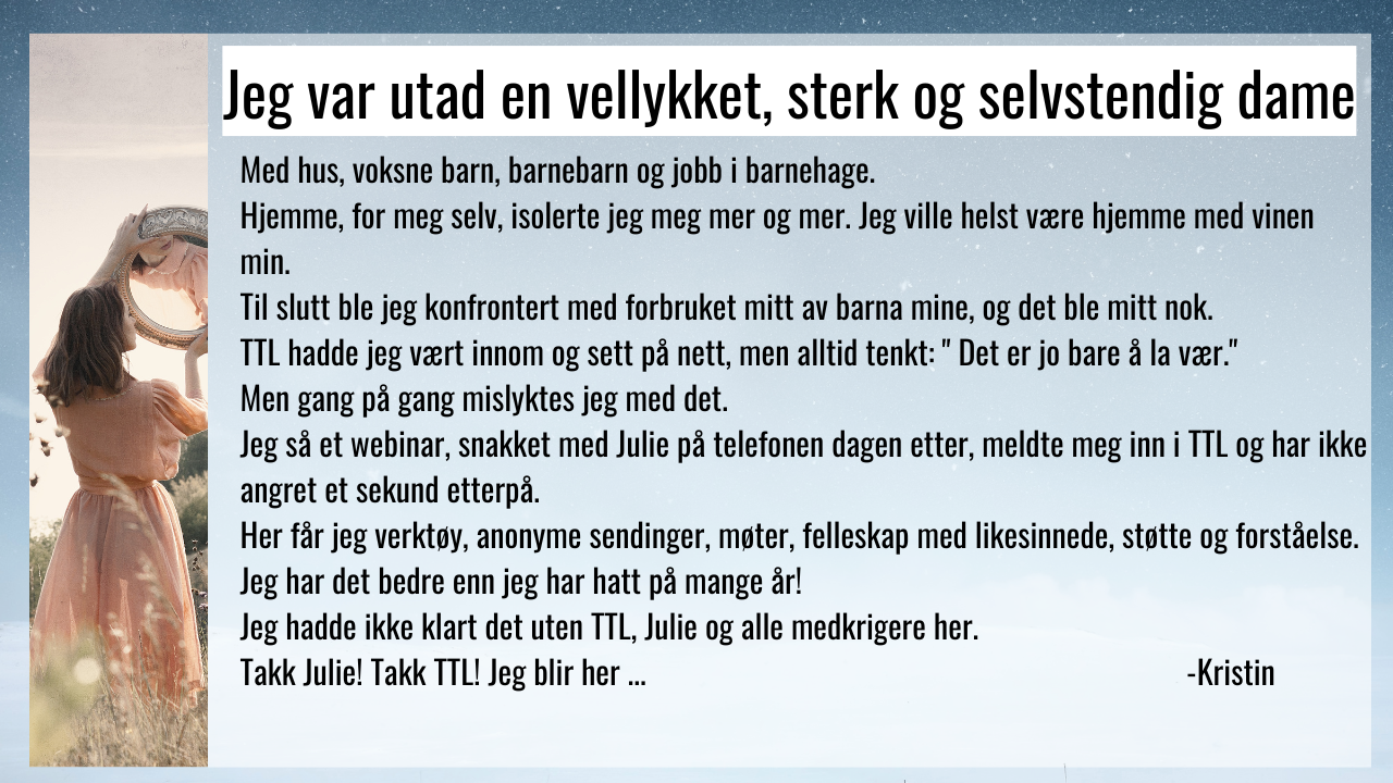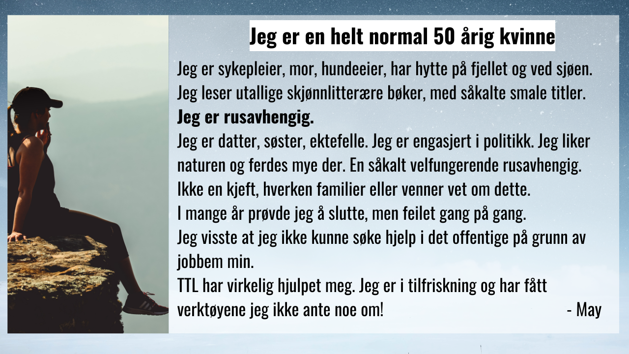Dette skjer UTEN krav til edru/nykterskap. Det er den eneste mÄten vi fÄr til det vi selv vil pÄ, uten moralske krav med ubrukelige fortegn og setninger. Her i Tilbake Til Livet er det ingen Mà , BURDE eller SKAL. Her blir du med pÄ en solid vei over 2000 mennesker har gÄtt fÞr deg siden vi startet i 2017.